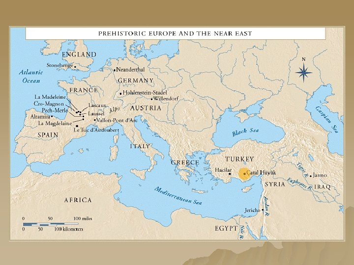 Prehistory u u u 2, 000 BCE – first tool making hominids (homo habilis) 1, 900, 000 BCE – homo erectus appears first hominids that walk upright 315, 000 BCE – first modern humans appear in Africa(homo sapiens) 200, 000 -100, 000 BCE – other types of homo sapiens sub species appear (Neanderthals, Rhodesiensis, Heidelbergensis, Denisova, Red Deer cave people) 100, 000 BCE – first evidence of religious practices (serious burials) 50, 000 BCE – fully modern language appears (vocal cords in skeletal remains)