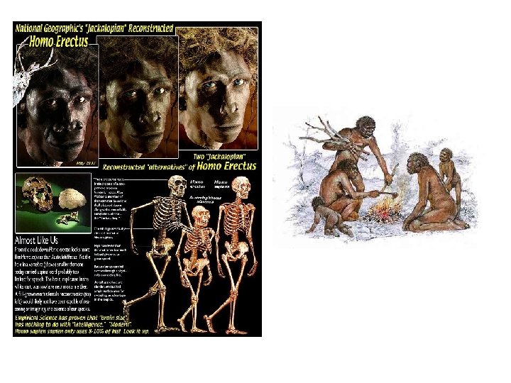 Development of Humans Homo Habilis Homo Erectus Latin for “upright man” Latin for “handy man” Lived in eastern Africa > spread north to Asia fossilized human bones found with stone tools and animal fossils Skulls – humans had a flatter head with a brain only 2/3 size; approximately 1. 5 m tall Built shelters of braches and collected bird eggs and wild berries for food; hunted wild pigs Tools / weapons = rocks, braches, sharp stones No clothes Did not know how to use fire Discoveries of “Java Man” (Indonesia) and “Peking Man” (China” Lived in Afria, south Europe, Asia Skulls- humans had long, flat and sharply angled at back (between ape and human head) Thighbone- identical to modern humans > walk upright Charred animals bones found = they used fire to cook Belief that homo erectus was a descendant of homo habilis Make fire= first by coals or volcanic ash; later by friction= made life easier as they could survive in colder climates Tools / weapons= bones, rocks, blades for carving, spears Homo Sapiens Latin for “reasoning man” 250 000 years ago= emergence of Homo Sapiens who evolved from homo erectus