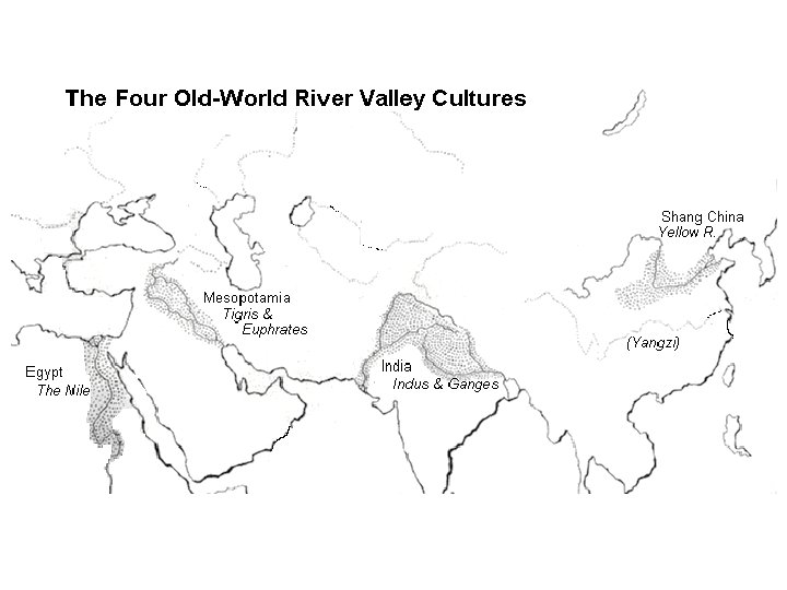IV. Characteristics of River Valley Civilizations A. The “Big” 4 and the Americas 1. 2. 3. 4. 5. 6. Mesopotamia Egypt India China Chavin Olmecs • (Tigris and Euphrates) (Nile) (Indus) (Hwang He / Yellow) What do all of these have in common?