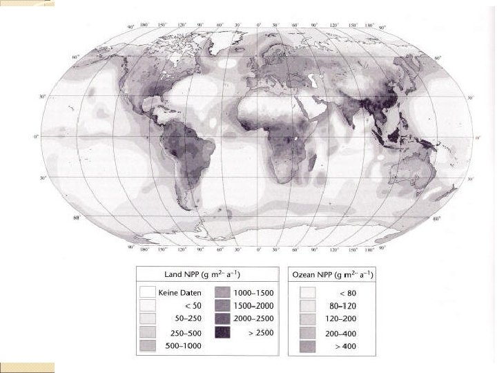 Produktivnost ekosistemov Bruto primarna produkcija - vsa s fotosintezo vezana energija Neto primarna produkcija - s fotosintezo vezana energija, ki ostane potem, ko ji odštejemo energijo porabljeno za dihanje rastlin Nanjo vpliva izpostavljenost sončnim žarkom