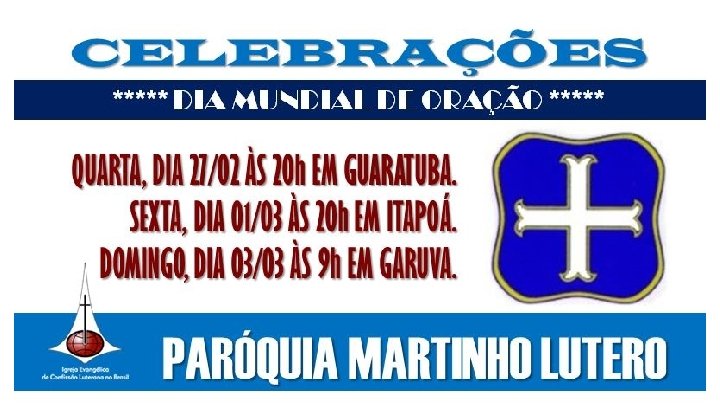 BRANCO – Boa noite! Como Comunidade de GUARATUBA estamos representando as mulheres da ESLOVÊNIA, que prepararam esta bela liturgia. AZUL – Estamos reunidos em nome do Deus, que é Pai, Filho e Espírito Santo. Aproveitamos a liberdade de Culto no país, permitindo tal momento mui especial de Celebração Ecumênica. VERMELHO – Venham! Tudo está preparado. Este é o tema do Culto, destacando a gratidão pelas dádivas recebidas e a necessidade de repartir as bênçãos.