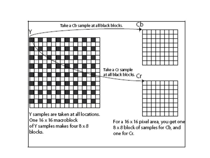 Pentru un macrobloc 16 x 16 se obtin un bloc 8 x 8 de esantioane Cb, un bloc 8 x 8 de esantioane Cr si 4 blocuri 8 x 8 de esantioane Y. Asemanator pentru subesantionarea 4: 2: 2 se esantioneaza fiecare al doilea pixel din fiecare rand pentru Cb si Cr.