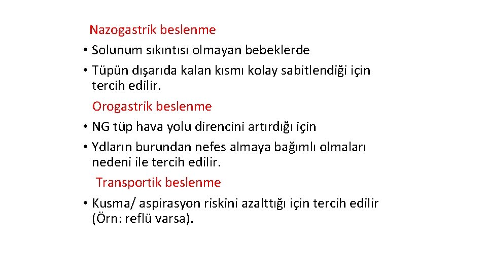 Nazogastrik beslenme • Solunum sıkıntısı olmayan bebeklerde • Tüpün dışarıda kalan kısmı kolay sabitlendiği için tercih edilir. Orogastrik beslenme • NG tüp hava yolu direncini artırdığı için • Ydların burundan nefes almaya bağımlı olmaları nedeni ile tercih edilir. Transportik beslenme • Kusma/ aspirasyon riskini azalttığı için tercih edilir (Örn: reflü varsa).