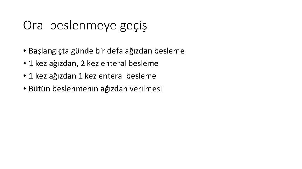 Oral beslenmeye geçiş • Başlangıçta günde bir defa ağızdan besleme • 1 kez ağızdan, 2 kez enteral besleme • 1 kez ağızdan 1 kez enteral besleme • Bütün beslenmenin ağızdan verilmesi