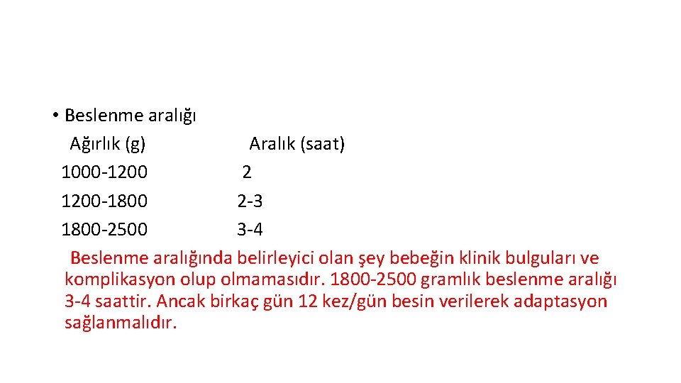 • Beslenme aralığı Ağırlık (g) Aralık (saat) 1000 -1200 2 1200 -1800 2 -3 1800 -2500 3 -4 Beslenme aralığında belirleyici olan şey bebeğin klinik bulguları ve komplikasyon olup olmamasıdır. 1800 -2500 gramlık beslenme aralığı 3 -4 saattir. Ancak birkaç gün 12 kez/gün besin verilerek adaptasyon sağlanmalıdır.