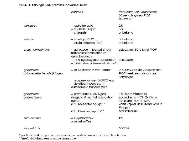 Definitie POF Prematuur ovarieel falen (POF) is de uitval van de ovariële functie voor het 40 e levensjaar, na het optreden van de menarche (NVOG richtlijn nr 39) Incidentie: neemt toe met de leeftijd: POF treft 1: 1000 vrouwen onder de 30 jaar en neemt dan toe tot 1: 100 onder de 40 jaar Epidemiologie: vaak genetische basis, familiale vorm in 431% der gevallen
