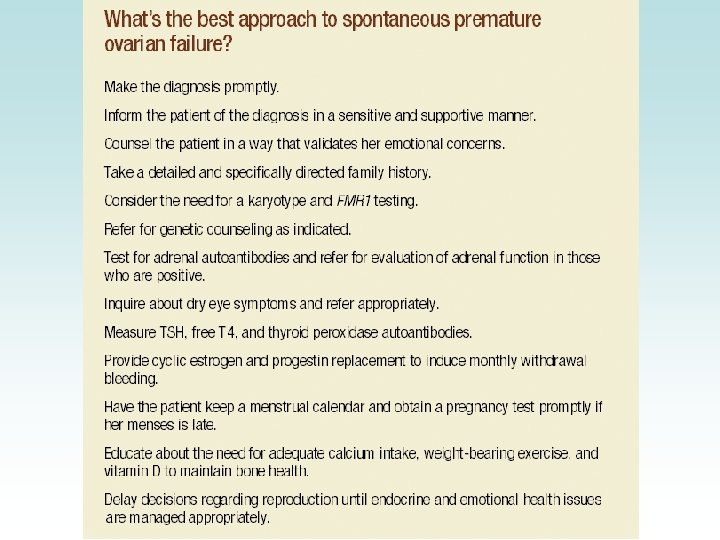 Diagnose POF Ø Diagnose: amenorree (4 md) + gestegen FSH (2 x > 40 IU/l) + hypo- oestrogeen (<25 pg/ml) +/- menopausale symptomen ; familale anamnese ! Ø Verdere investigaties: Ø Auto-antilichamen Ø Schildklier: 10 -25% POF = TMA(+) (thyroid microsomial antibodies) -> TSH ! Ø Bijnier: 1 -10% POF = SCA(+) (steroidal cell antibodies) -> 50% M. Addison: ACTH test ! Ø Laparoscopie/biopsie: DD follikeldepletie of « resistant ovary » : obsoleet