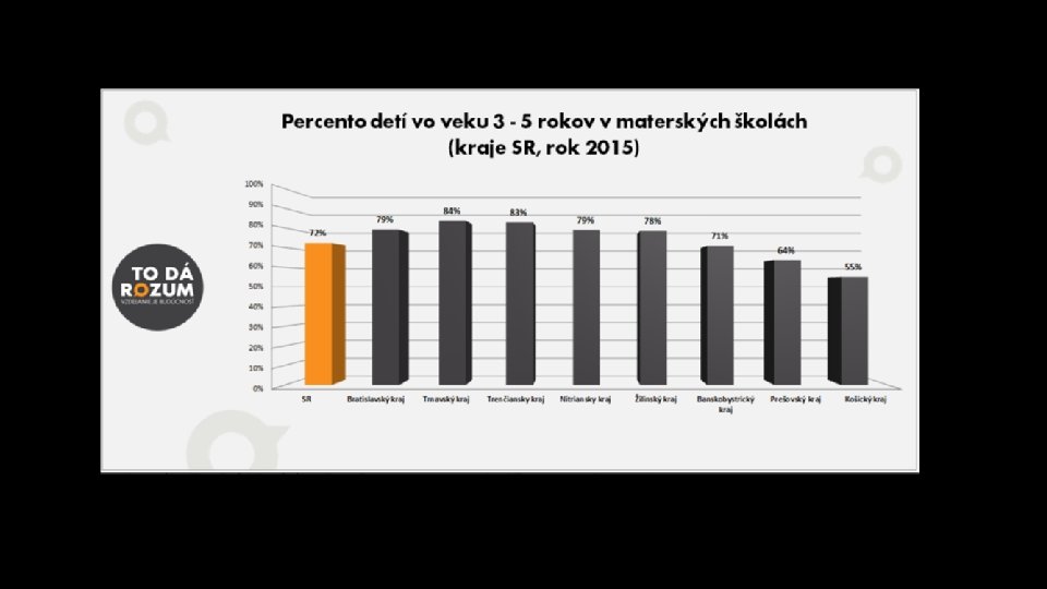 • Z celkového počtu 2 927 obcí ju má 2 036, teda takmer tretina našich obcí žiadnu materskú školu nemá. • Vo veku 3 – 5 rokov máme na Slovensku viac ako 177 525 detí, v materských školách je z nich 128 314, teda 72 % • Na Slovensku je zhruba 40 percent detí so zdravotným znevýhodnením, ktoré nenavštevujú materské školy. • Len 34 percent rómskych detí navštevuje materské školy. • Slovensko je druhou najhoršou krajinou v počte detí, ktoré navštevujú MŠ • Na Slovensku pripadá na učiteľa 12, 4 študenta. Nikde v európskych krajinách nie je priemer pod 15