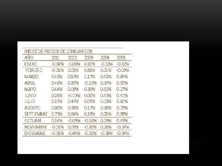 EJEMPLO : SE DESPRENDE QUE EL PROMEDIO MENSUAL DESDE SEPTIEMBRE DE 2001 HASTA AGOSTO DEL 2006 ALCANZA 1. 03 % LO Q EXPRESADO EN TERMINOS ANUALES SIGNIFICA UNA RENTABILIDAD NOMINAL DEL 12. 3% SIN EMBARGO. ESTE RENDIMIENTO DEBE SER AJUSTADO POR EL CAMBIO EN EL NIVEL DE PRECIOS DE LA ECONOMIA PARA ASI OBTENER LA RENTABILIDAD. PARA ELLO SE DEBERA ESTIMAR UN INDICE DE PRECIOS ANUAL REPRESENTATIVO, PARA LO CUAL SE CONSIDERA EL RENDIMIENTO DEL INDICE DE PRECIOS AL CONSUMIDOR DE LOS ULTIMOS 60 MESES