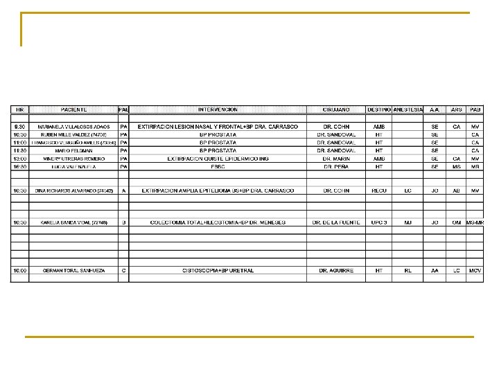 n En pabellón se consignan los datos imprescindibles: q q q el hora del pabellón nombre del paciente numero de ficha, diagnóstico, edad, previsión,