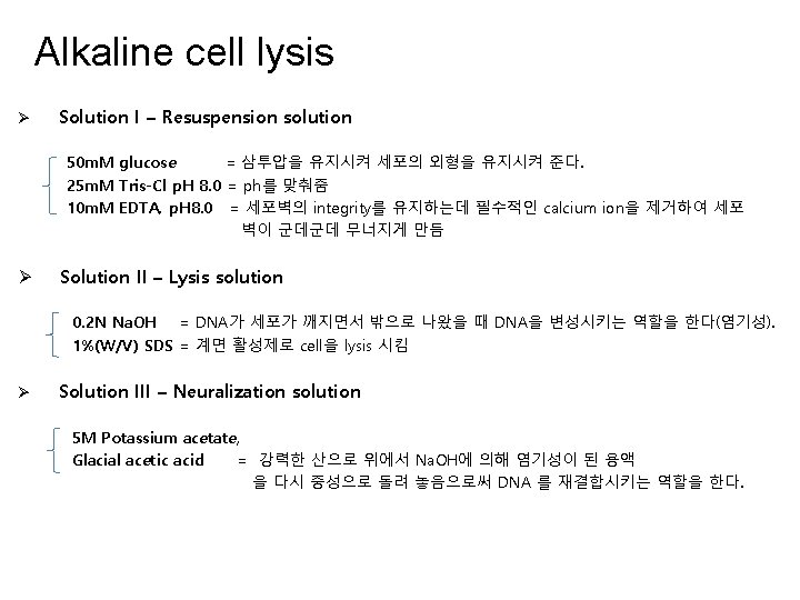 Materials Alkaline cell lysis Solution I – Resuspension solution 50 m. M glucose 25 m. M Tris-Cl p. H 8. 0 10 m. M EDTA, p. H 8. 0 Solution II – Lysis solution 0. 2 N Na. OH 1%(W/V) SDS Solution III – Neuralization solution 5 M Potassium acetate Glacial acetic acid Anion-exchange-based DNA purification Anion-exchange-based column Buffer EQU buffer-low salt Buffer WASH buffer-medium salt Buffer ELU buffer-high salt isopropanol 70% Et-OH D. W