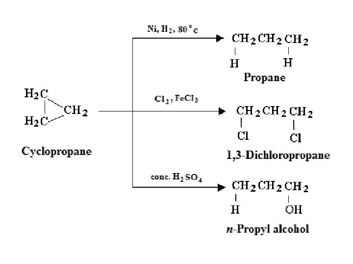 1 - Cyclization A dihalides can bring about coupling between two alkyl groups that are part of the same molecule. 1, 3 -Dichloropropane Cyclopropane 2 - Hydrogenation (Industrial source) Addition of hydrogen to aromatic compounds yields cyclic aliphatic compounds, specifically cyclohexane derivatives. An important example of this is the hydrogenation of benzene to yield pure cyclohexane.