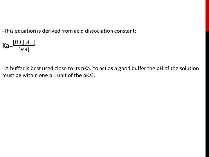 -The Henderson-Hasselbalch equation, is an equation that is often used to: 1 - To calculate the PH of the Buffer. 2 -To preparation of Buffer. -It relates the Ka [dissociation constant] of a weak acid , [HA] concentration Of weak acid component , [A-] concentration Of conjugate base [salt of the weak acid] component and the p. H of the buffer. The equation is derived from the acid dissociation constant. Note: Ka is weak acid dissociation constant