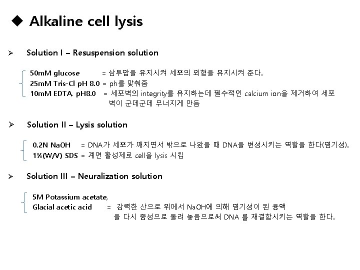 Materials Alkaline cell lysis Solution I – Resuspension solution 50 m. M glucose 25 m. M Tris-Cl p. H 8. 0 10 m. M EDTA, p. H 8. 0 Solution II – Lysis solution 0. 2 N Na. OH 1%(W/V) SDS Solution III – Neuralization solution 5 M Potassium acetate Glacial acetic acid Anion-exchange-based DNA purification Anion-exchange-based column Buffer EQU buffer-low salt Buffer WASH buffer-medium salt Buffer ELU buffer-high salt isopropanol 70% Et-OH D. W