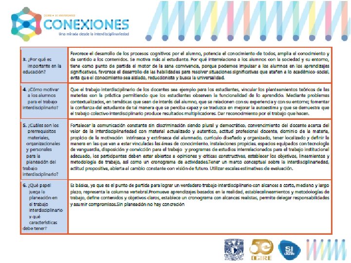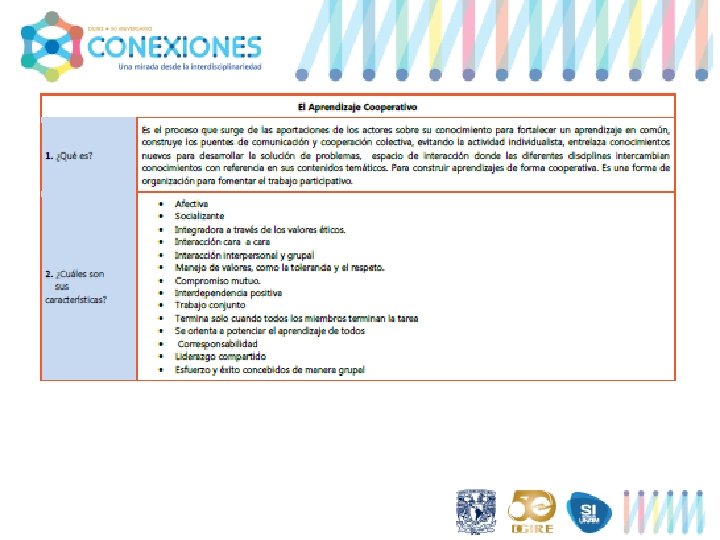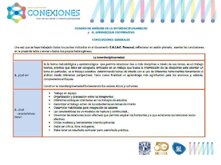 Proyecto conexiones: Web Color Chem Equipo No. 4 Producto 1. C. A. I. A. C. Conclusiones generales CUADRO DE ANÁLISIS DE LA INTERDISCIPLINARIEDAD y EL APRENDIZAJE COOPERATIVO CONCLUSIONES GENERALES Una vez que se haya trabajado todos los puntos indicados en el documento C. A. I. A. C. Personal, reflexionar en sesión plenaria, asentar las conclusiones en la presente tabla y enviar a todos los grupos heterogéneos. Volver al índice