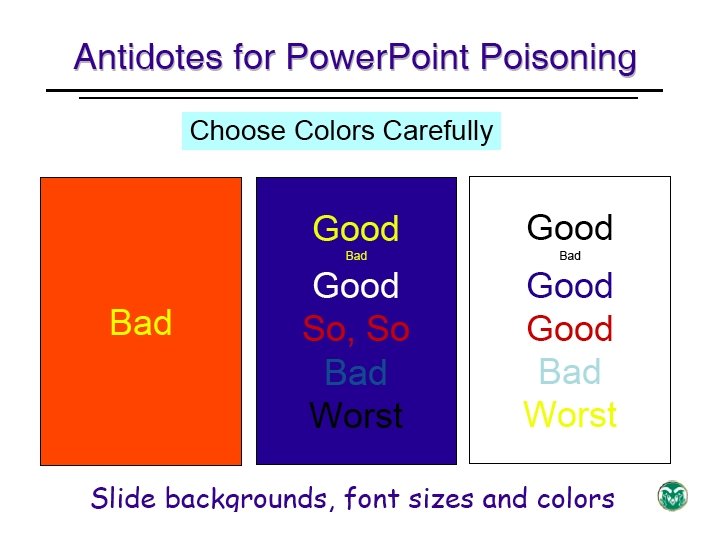 Powerpoint basics: 2. Color Avoid red-green combinations because a large fraction of the human population is red-green colorblind. Lots of people can’t read this – and even if they could, it makes your eyes hurt.