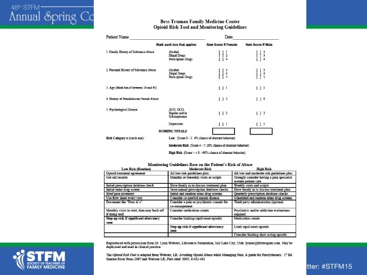 Opioid Risk Tool • Assesses Family and personal history of substance abuse • Age • History of prior sexual abuse • Psychiatric history • Places patients in risk categories • Provides monitoring guidelines for each category