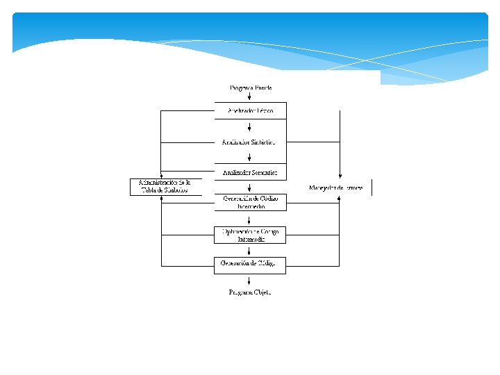 Generador de código intermedio En esta etapa se lleva la preposición a una representación intermedia como un programa para una maquina abstracta. temp 1= tipo_ent(10) temp 2= id 3 * temp 1 temp 3= id 2 + tem 2 id 1= temp 3 Optimización de código El código intermedio obtenido es representado de una forma mas optima y eficiente. temp 1= id 3 * 10. 0 id 1= id 2 + temp 1 Generador de código Finalmente lleva el código intermedio a un código objeto que en este caso es un código relocalizable o código ensamblador (también llamado código no enlazado). MOVF id 3, R 2 MULT #10. 0, R 2 MOVF id 2, R 1 ADDF R 2, R 1 MOVF R 1, id 1