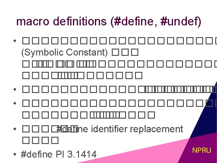 Source file inclusion (#include) • #include �������� source program • ������ #include <filename> ���� #include “filename” • �������� (text file) #include <stdio. h> includes stdio. h include folder • < <������� �� from system. s ����� #include <iostream> includes cpp class library header iostream (C: TCINCLUDE) #include<my. cpp> includes my. cpp file from include folder #include “my. h” includes my. h file from current working folder • “” ������� �� directory ���� source #includes abc. h file from the myfolder which is available in “myfolder/abc. h” current working folder code https: //www. codingunit. com/cplus-tutorialpreprocessor-directives