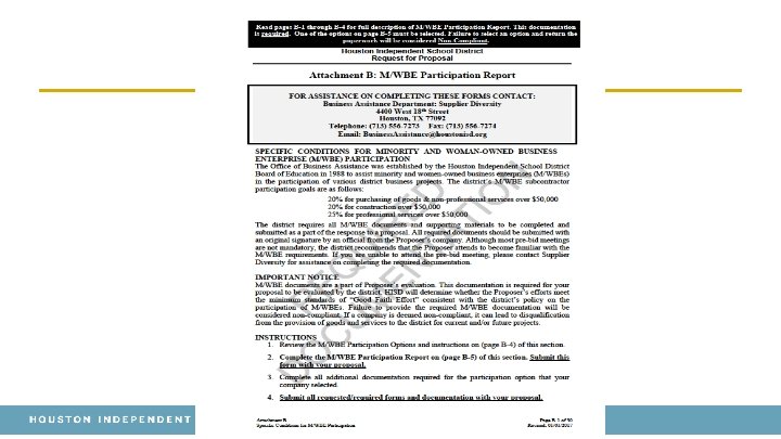 Attachment B: M/WBE Participation Report Instructions • • • Documentation is required. Read pages B-1 through B-4 for full description of M/WBE Participation Report. One of the options on page 5 must be selected. Failure to select option and return the paperwork will be considered Non-Compliant. – 20% for purchasing of goods & non-professional services over $50, 000 – 20% for construction over $50, 000 – 25% for professional services over $50, 000