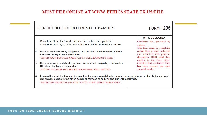 FORM J: Instructions for Completion of Disclosure of Interested Persons Certification (HB 1295) (2 pages) • Must be filled out electronically with Texas Ethics Commission.