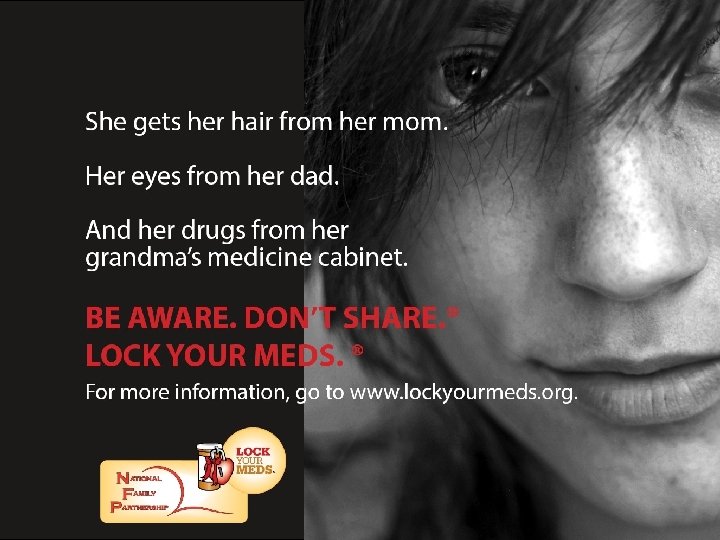 The Solution Lock Your Meds™ • National campaign created by National Family Partnership (NFP) – Create awareness to “unwitting suppliers” • Powerful messages, using traditional and new social marketing venues