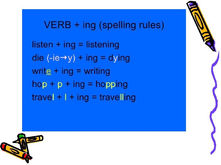 glagol + -ing – pravila pisanja 1. Osnovno pravilo je da na glagol dodajemo nastavak – ing listen → listen + ing = listening talk → talk + ing = talking 2. 3. 4. Ako se glagol završava dvoglasnikom “ie”, on se mijenja u “y” ispred nastavka –ing. → die + ing = dying Nijemo “e” na kraju glagola se gubi ispred nastavka –ing. → write + ing = writing Kada se glagol završava na kratak i naglašen suglasnik, taj se suglasnik udvostručuje ispred nastavka – ing cut + ing = cutting hop + ing = hopping travel + ing = travelling (Amer. E → traveling)