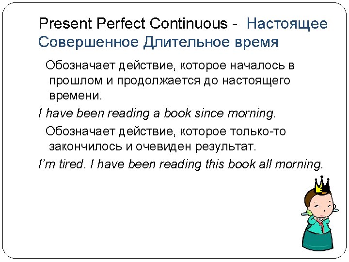 Форма образования Have/has been +Ving утвердительное I You have been We reading They отрицательное I You haven’t been We reading They He He She has been reading She hasn’t been reading it it вопросительное I Have you been reading we they she Has he been reading it