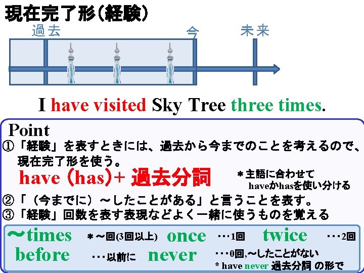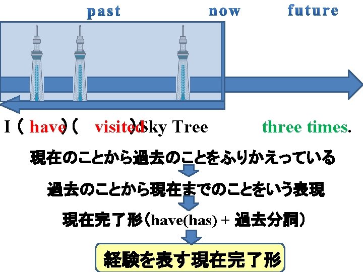 Present Perfect Tense Do you want to visit Slides: 17 Download presentation Present Perfect Tense Do you want to visit Sky Tree? I visited Sky Tree three months ago. I visited Sky Tree last year. I visited Sky Tree three years ago. ① visit Tokyo Dome I 3 times I ( have )( visited) Tokyo Dome ( three ) times ( ). ② You visit Tokyo Dome 3 times You ( have)( visited) Tokyo Dome ( ) times ( three ). ③ visit Asakusa Tom 3 times Tom ( has )( visited) Asakusa ( three ) times ( ). ④ Judy visit Asakusa once Judy ( has)( visited ) Asakusa (once ). ⑤ They eat Monjayaki twice They ( have)( eaten) Monjayaki ( twice ). ⑥ eat Monjayaki We four times We ( have )( eaten ) Monjayaki ( ) times ( four ). ⑦ I I ( have )( play that video game many times played) that video game ( ) times ( many ). ⑧ take Kagayaki Bob before Bob ( has )( taken) Kagayaki ( before ). ⑨ take Kagayaki I never I ( have )( never)( ) Kagayaki. taken ⑩ Aiko ( has)( read the book never)( ) the book. read