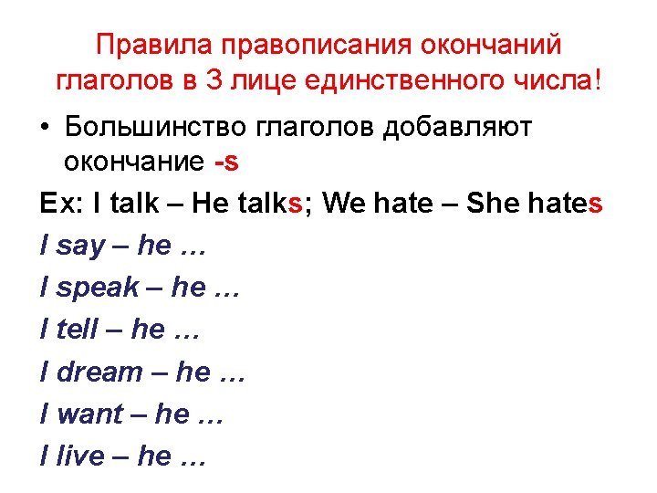 Say and tick • I play – he plays • I take – he takes • I have – he has • I see – he sees • I go – he goes • I do – he does • I want – he wants • I wash – he washes • I watch – he watches [s] [z] + [iz] + + + +