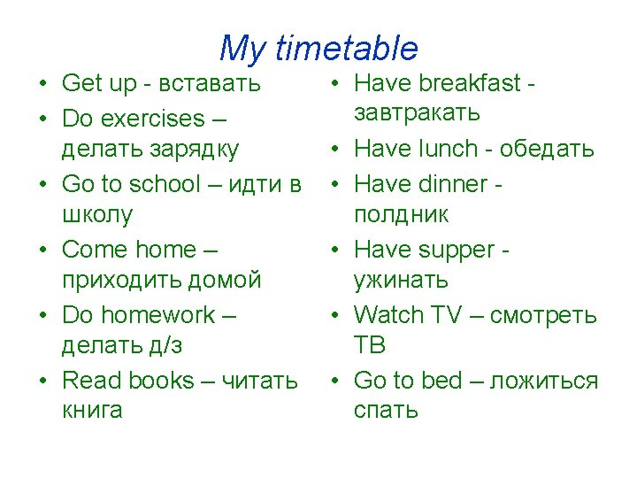 • • My brother and me come… home at 14. 00 I usually do… homework at 15. 00 And he do… homework in the evening. My brother watch… TV from 15 till 18 Then mother and father come… home. Our family usually have… supper at 20. 00 After supper my Mum always read… a book. • And we go… to bed at 22. 00