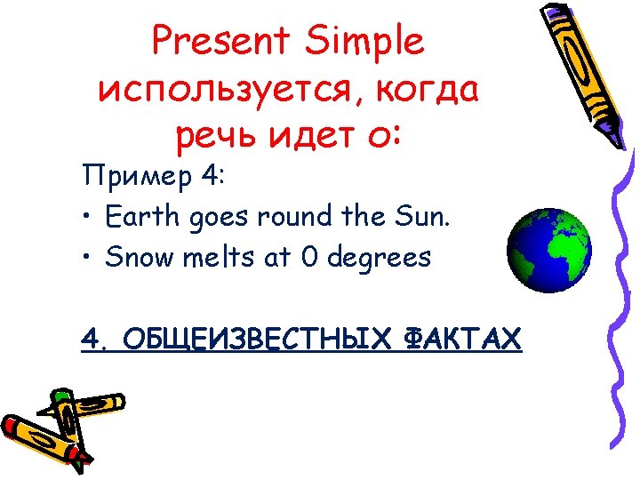Present Simple используется, когда речь идет о: Пример 2: • He goes to the swimming pool on Wednesdays. • They visit their Granny on Sundays 2. ПОВТОРЯЮЩИХСЯ ДЕЙСТВИЯХ