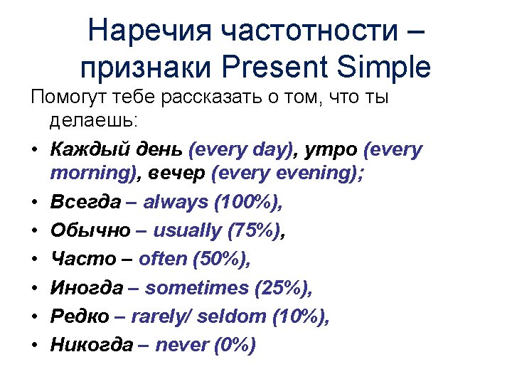 Present Simple используется, когда речь идет о: Пример 3: • You do homework every evening. • I usually do my household chores after school. 3. ПОВСЕДНЕВНЫХ ДЕЙСТВИЯХ