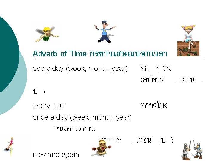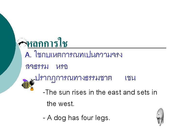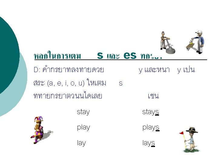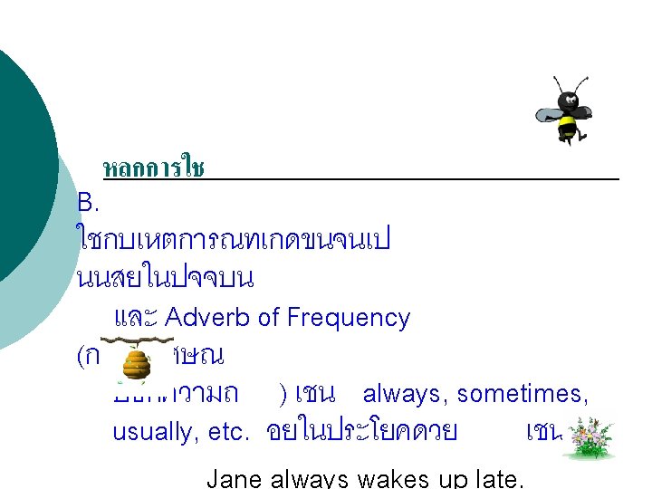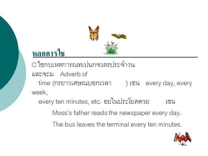 โครงสรางประโยคบอกเลา : (Affirmative Sentence) Structure = Subject + verb 1 (s, es) Examples Sunee goes to school every weekday. Jenny always drinks milk before going to bed.