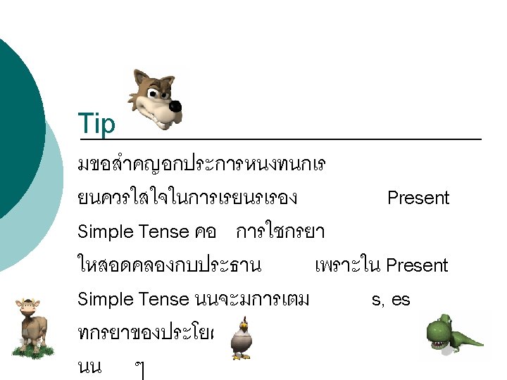 โครงสรางประโยคบอกเลา : (Affirmative Sentence) Structure = Subject + verb 1 (s, es) Examples Sunee