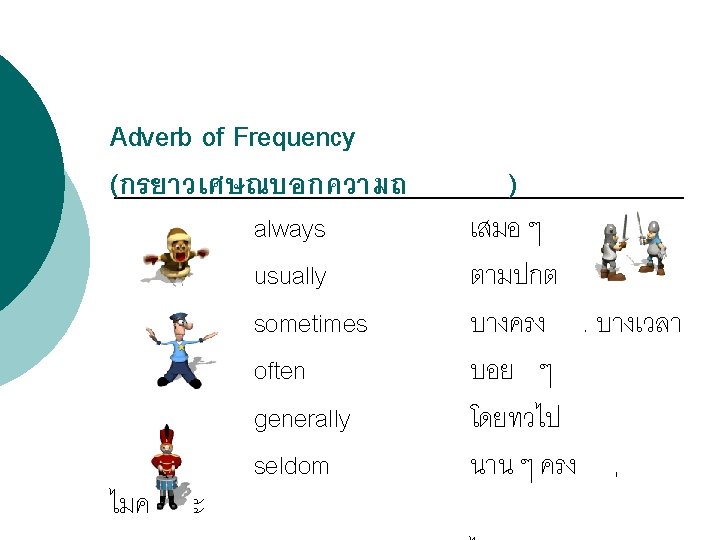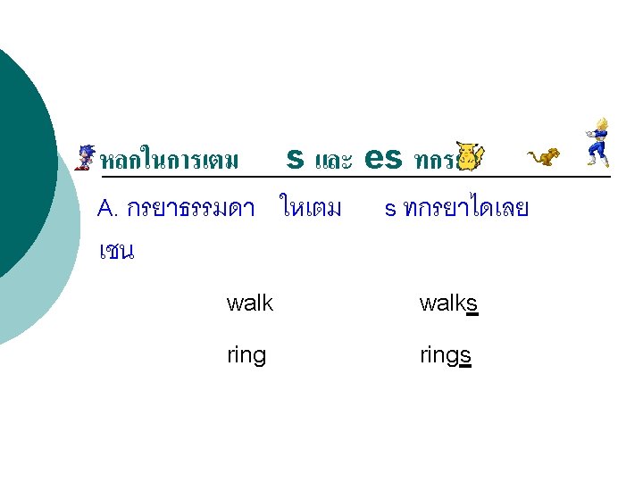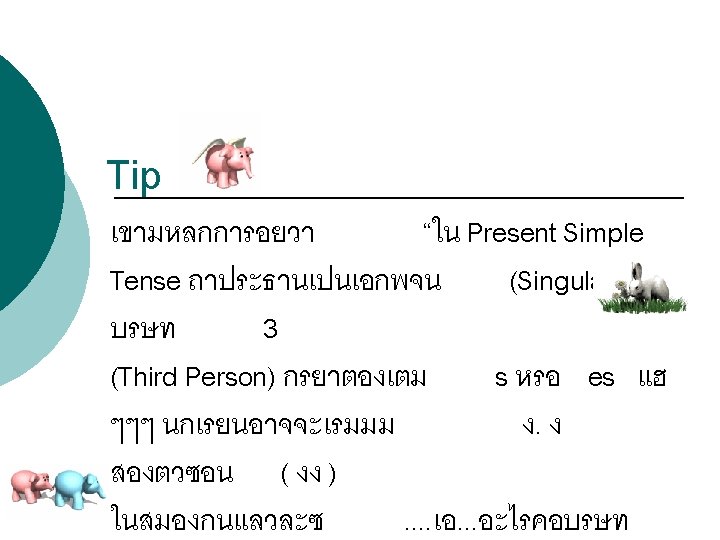 โครงสรางประโยคบอกเลา : (Affirmative Sentence) Structure = Subject + verb 1 (s, es) Examples Sunee goes to school every weekday. Jenny always drinks milk before going to bed.