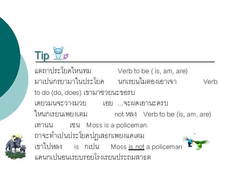 โครงสรางประโยคปฏเสธ : (Negative Sentence) Structure = Subject + does/do + not + verb 1 (doesn’t/ don’t) Examples Sunee doesn’t go to school every weekday. Jenny doesn’t drink milk before going to bed.