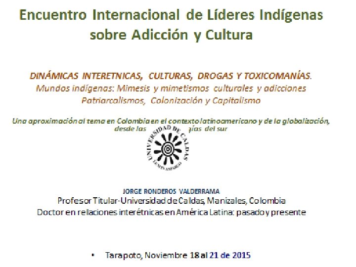 Compulsiones y adicciones un fenómeno humano e interétnico. Del patriarcalismo al capitalismo • ONIC: 102 pueblos. 1. 378. 884. • DANE censo 2005. 1. 392. 623 • ONIC, CECOIN y 85 grupos étnicos indígenas. • Suicidios. 2010 a 2014. 61 suicidios registrados. Medicina legal. Disminuye en 2014 a 4 mientras 2010 17. Tendencia aumento zona urbana. Mayor proporción en el Cauca. • Causas Conflictos pareja 24. 6% • Sentimentales-afectivas: 32. 8% • Desamor 8. 2 • Sin información 59. 0 • Formas: Intoxicación (envenenamiento) 52. 5% • Ahorcamiento y asfixias: 31. 1%