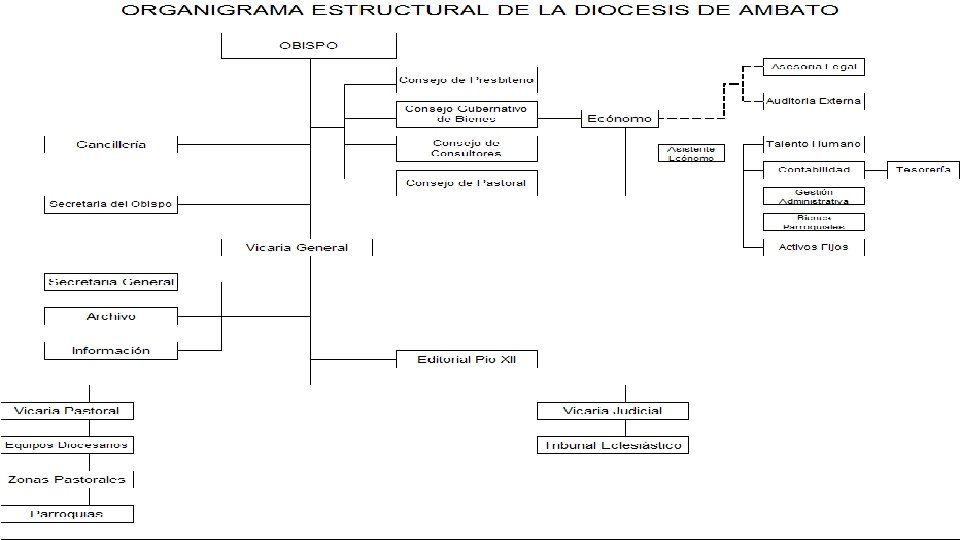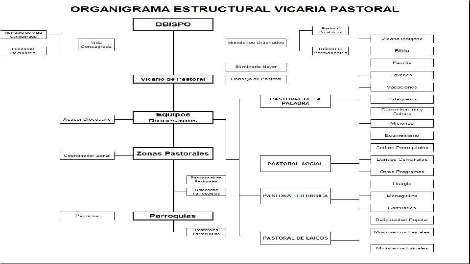 MARCO OPERATIVO Objetivo General Organigrama estructural de la Diócesis de Ambato Organigrama estructural de la Vicaria de Pastoral Las distintas Pastorales están agrupadas en: PASTORAL DE LA PALABRA - Encarnación. PASTORAL SOCIAL – CÁRITAS – Kenosis PASTORAL LITÚRGICA – Resurrección PASTORAL LAICAL – Kerigma y Discipulado Y presentan sus actividades y su plan de formación