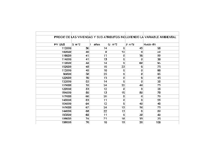 Valores de las propiedades (derivados de datos cruzados o series históricas) así como características de las viviendas, vecindario y comunidad para un área de mercado bien definida que incluya viviendas con niveles distintos de calidad ambiental, o diferentes distancias a una amenidad tales como espacios de esparcimiento (espacios abiertos como parque) o las playas.