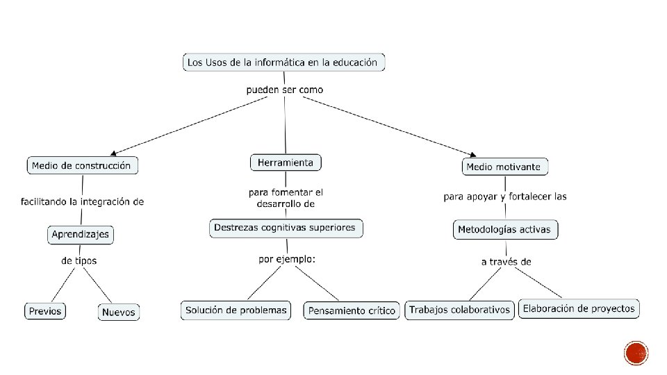Como herramienta: • Permite enseñar, aprender y practicar mediante el uso de diferentes aplicaciones. Como medio de aprendizaje: • Busca emplear la interactividad, captando la atención y el interés por las actividades. Como fin de aprendizaje: • Se refiere a la informática como un contenido objeto de estudio.