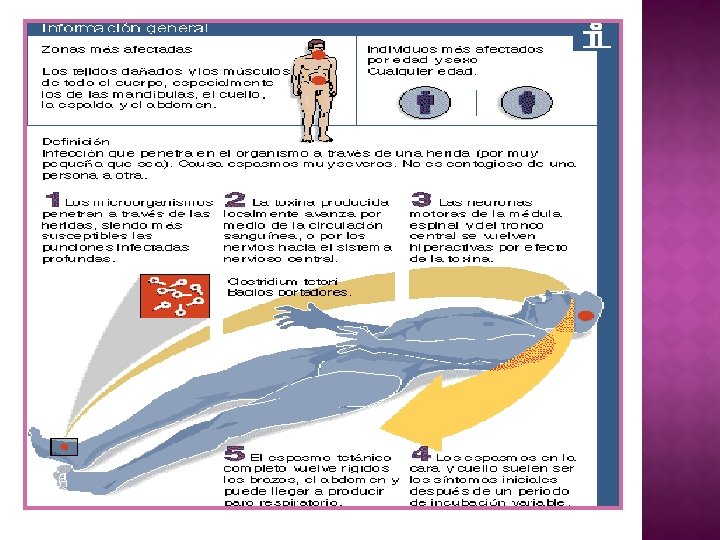 ¿ QUÉ ES EL TÉTANOS ? El tétanos es una enfermedad muy grave provocada por la toxina de una bacteria llamada clostridium tetánico y se produce como consecuencia de la contaminación de heridas con este germen. La potente toxina tetánica actúa como un veneno que afecta al sistema nervioso central, causando rigidez muscular generalizada, espasmos dolorosos, dificultad para respirar y tragar, convulsiones y otros síntomas que amenazan la vida del enfermo.