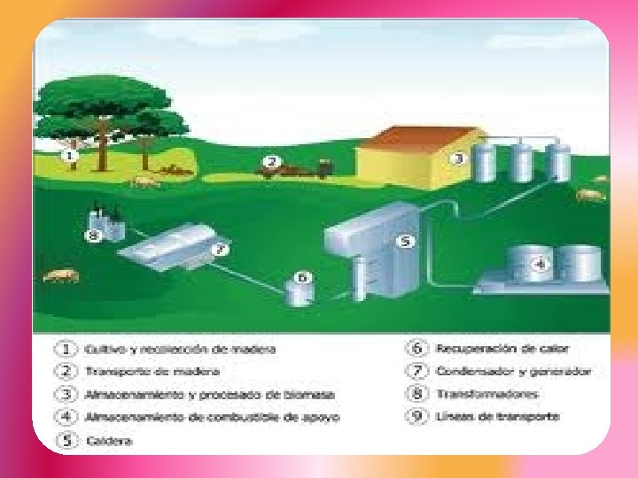 • Energía de Biomasa: • La biomasa es cualquier material de tipo orgánico proveniente de seres vivos que puede utilizarse para producir energía. Se produce al quemar biomasa, como madera o plantas. • Utilizan tecnologías que dependen de la cantidad y clase de biomasa disponible. Con los principales sistemas de transformación pueden obtenerse combustibles, energía eléctrica, fuerza motriz o energía térmica.