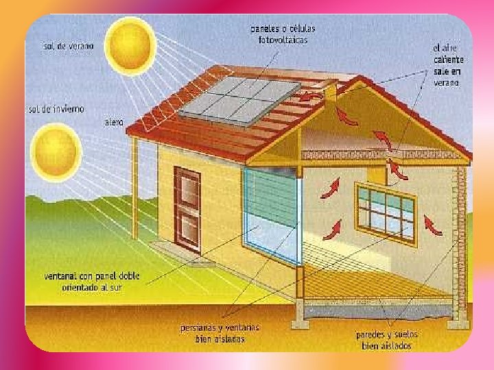 • la cual procede del sol y es una fuente directa o indirecta de casi toda la energía que usamos. El aprovechamiento directo de la energía del sol se hace de diferentes formas: • Calentamiento directo de locales por el sol, en locales se aprovecha el sol para calentar el ambiente.