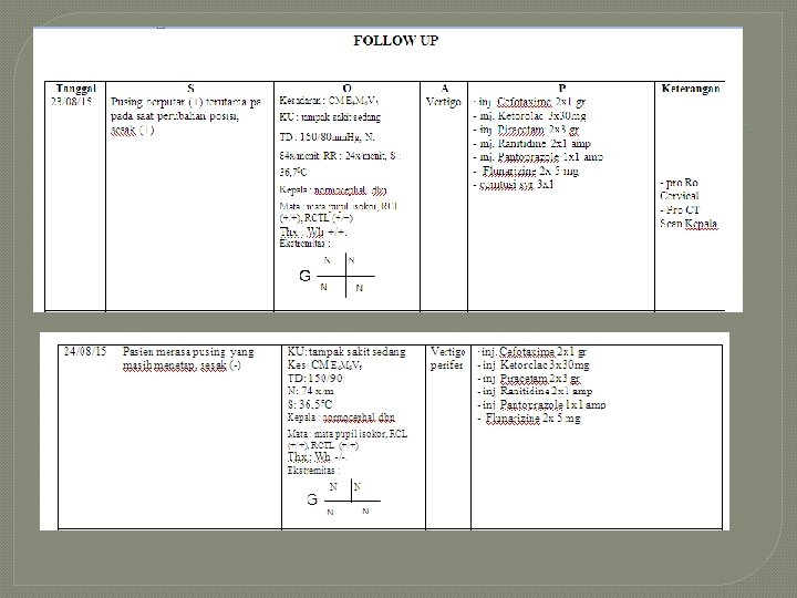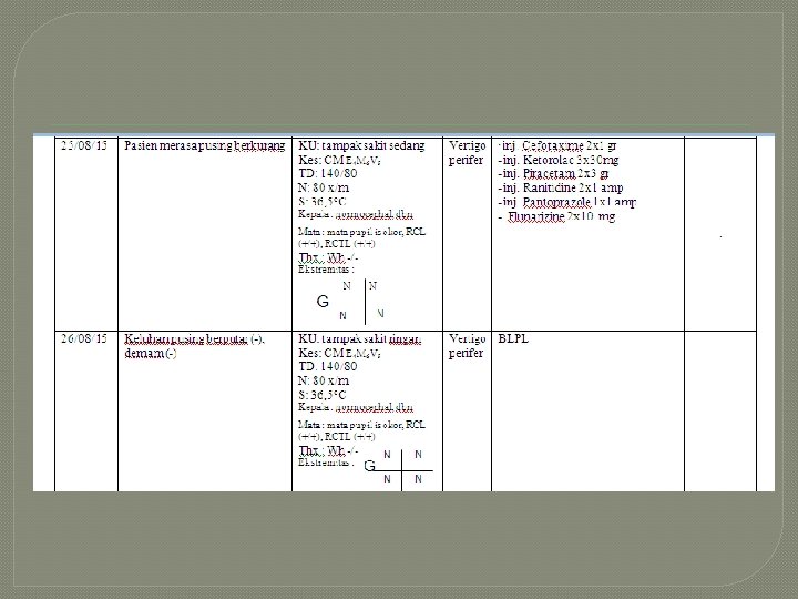 Riwayat Penyakit Sekarang • pusing berputar 3 hari • T’utm saat perubahan posisi : tidur -> duduk, dan sebaliknya, berlangsung beberapa detik - berkurang • pusing berputar saat melihat cahaya lampu (-)dan pada keadaan ramai (-) • mual , tidak muntah, • tidak berkeringat dan tidak ada penurunan kesadaran. • Tdk dpt duduk lama -> terasa ingin jatuh • Lebih nyaman posisi tidur -> pusing berkurang