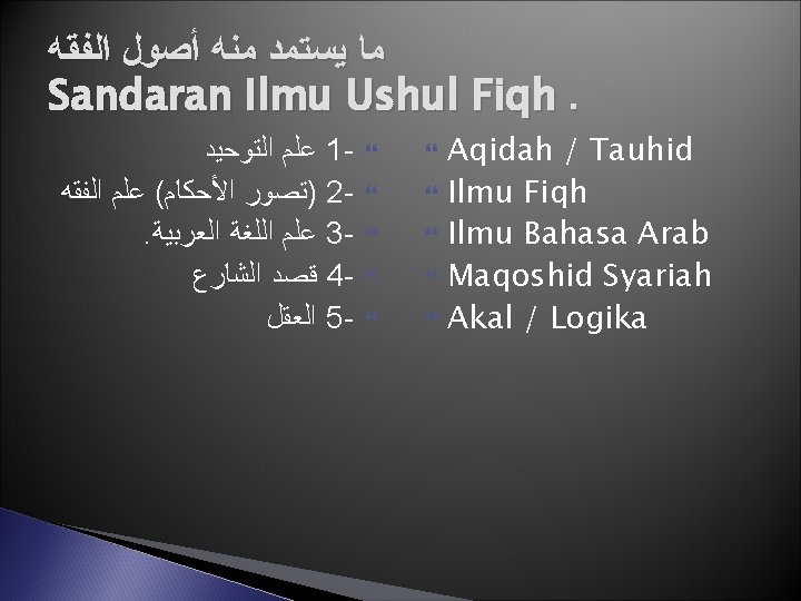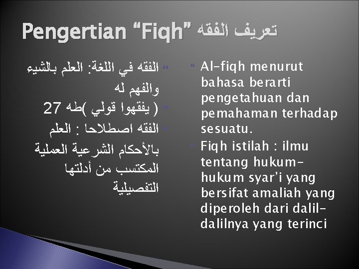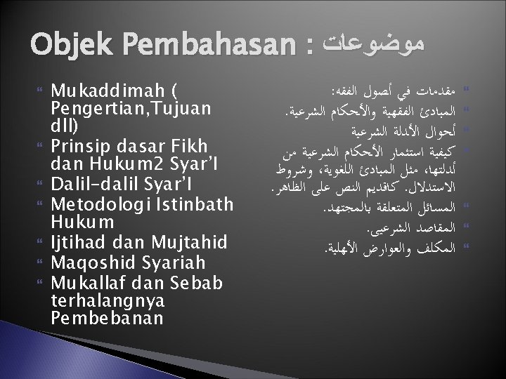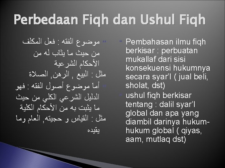 Penjelasan Pengertian Ushul Fiqh ﻣﻌﺮﻓﺔ ﺩﻻﺋﻞ ﺍﻟﻔﻘﻪ ﺇﺟﻤﺎﻻ ﻭﻛﻴﻔﻴﺔ ﺍﻻﺳﺘﻔﺎﺩﺓ ﻣﻨﻬﺎ ﻭﺣﺎﻝ ﺍﻟﻤﺴﺘﻔﻴﺪ Contoh dalil yang bersifat global: dalil tentang sunnah sebagai hujjah (sumber hukum), dalil bahwa setiap perintah pada dasarnya menunjukkan sebuah kewajiban, setiap larangan berarti haram, bahwa sebuah ayat dengan lafazh umum berlaku untuk semua meskipun turunnya berkaitan dengan seseorang atau kasus tertentu, dan lain-lain. Yang dimaksud dengan menggunakan dalil dengan benar misalnya: mengetahui mana hadits yang shahih mana yang tidak, mana dalil yang berbicara secara umum tentang suatu masalah dan mana yang menjelaskan maksudnya lebih rinci, mana ayat/hadits yang mengandung makna hakiki dan mana yang bermakna kiasan, bagaimana cara menganalogikan (mengkiaskan) suatu masalah yang belum diketahui hukumnya dengan masalah lain yang sudah ada dalil dan hukumnya, dan seterusnya. Kondisi mujtahid : syarat-syarat yang harus dipenuhi oleh seorang mujtahid untuk dapat mengambil kesimpulan sebuah hukum dengan benar dari dalil-dalil Al-Qur’an maupun sunnah Rasulullah saw.