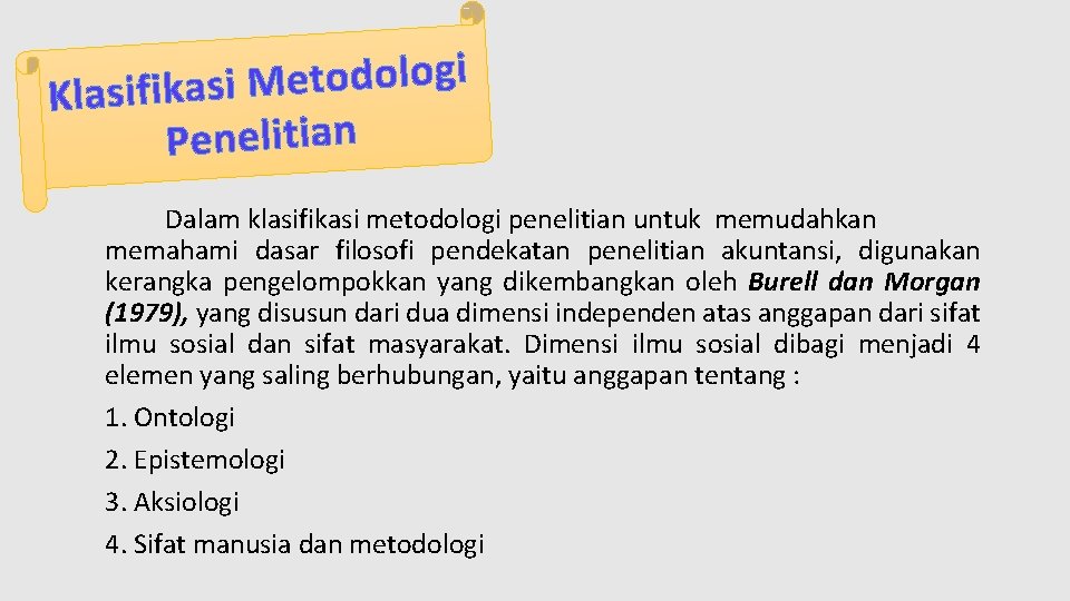 i g o l o d o t e M Klasifikasi Penelitian Dalam klasifikasi metodologi penelitian untuk memudahkan memahami dasar filosofi pendekatan penelitian akuntansi, digunakan kerangka pengelompokkan yang dikembangkan oleh Burell dan Morgan (1979), yang disusun dari dua dimensi independen atas anggapan dari sifat ilmu sosial dan sifat masyarakat. Dimensi ilmu sosial dibagi menjadi 4 elemen yang saling berhubungan, yaitu anggapan tentang : 1. Ontologi 2. Epistemologi 3. Aksiologi 4. Sifat manusia dan metodologi