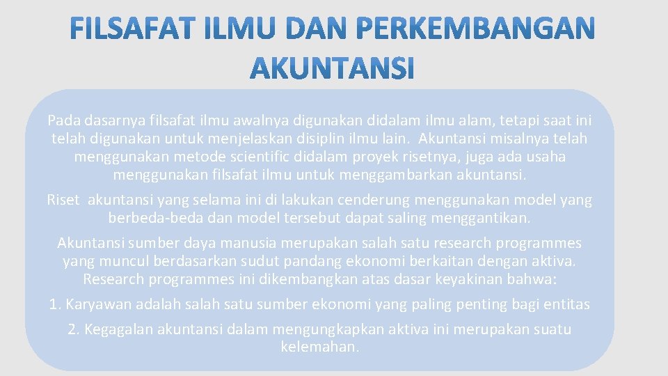 Pada dasarnya filsafat ilmu awalnya digunakan didalam ilmu alam, tetapi saat ini telah digunakan untuk menjelaskan disiplin ilmu lain. Akuntansi misalnya telah menggunakan metode scientific didalam proyek risetnya, juga ada usaha menggunakan filsafat ilmu untuk menggambarkan akuntansi. Riset akuntansi yang selama ini di lakukan cenderung menggunakan model yang berbeda-beda dan model tersebut dapat saling menggantikan. Akuntansi sumber daya manusia merupakan salah satu research programmes yang muncul berdasarkan sudut pandang ekonomi berkaitan dengan aktiva. Research programmes ini dikembangkan atas dasar keyakinan bahwa: 1. Karyawan adalah satu sumber ekonomi yang paling penting bagi entitas 2. Kegagalan akuntansi dalam mengungkapkan aktiva ini merupakan suatu kelemahan.
