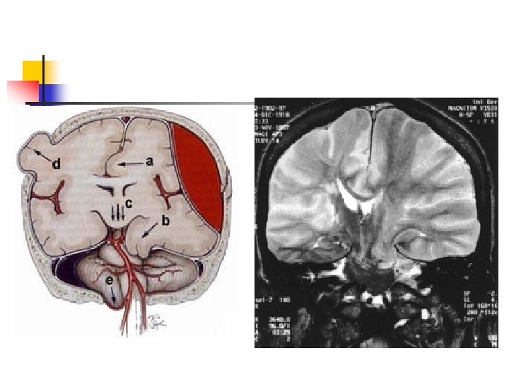 Raised ICP and brain shift A. B. C. D. E. Cingulate herniation Uncal herniation Central herniation Outside herniation Tonsillar herniation