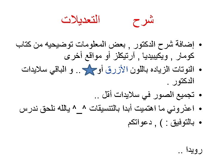 ﻻﺯﻡ ﺗﻌﺮﻓﻮﺍ ﺑﺸﻜﻞ ﻋﺎﻡ ﻣﻌﻨﺎﻫﺎ ﺍﻟﺪﻛﺘﻮﺭ ﻳﻘﻮﻝ ﻣﺎﻟﻜﻢ ﻣﻄﺎﻟﺒﻴﻦ ﺑﺲ : ﺍﻟﻤﺼﺪﺭ http: //webcache. googleusercontent. com/search? q=cache: 75 Pb. OYx. Ob. MQJ: www. cancer. gov/cancertopics/factsheet/detection/st aging+tumor+stage&cd=2&hl=ar&ct=clnk&gl=sa&source=www. google. com. sa • Primary Tumor (T) TX Primary tumor cannot be evaluated T 0 No evidence of primary tumor Tis Carcinoma in situ (CIS; abnormal cells are present but have not spread to neighboring tissue; although not cancer, CIS may become cancer and is sometimes called preinvasive cancer) T 1, T 2, T 3, T 4 Size and/or extent of the primary tumor Regional Lymph Nodes (N) NX Regional lymph nodes cannot be evaluated N 0 No regional lymph node involvement N 1, N 2, N 3 Involvement of regional lymph nodes (number of lymph nodes and/or extent of spread) Distant Metastasis (M) MX Distant metastasis cannot be evaluated M 0 No distant metastasis M 1 Distant metastasis is present